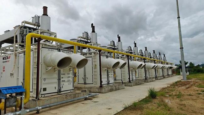 該電站項(xiàng)目用于居民辦公和生活用電,采用孤島模式運(yùn)行,以液化天然氣(LNG)作為核心能源,配套8臺(tái)濰柴博杜安12M33集裝箱式燃?xì)獍l(fā)電機(jī)組,總裝機(jī)容量8×800kW。